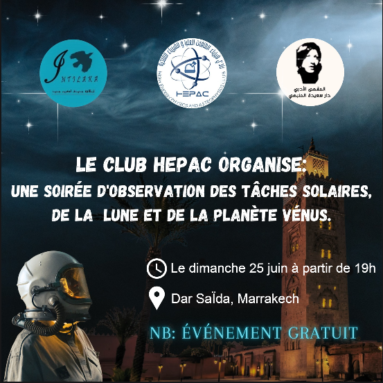 The High Energy and Astrophysics Club is pleased to organize an evening of observing sunspots, the Moon, and the planet Venus at Dar Saida in Marrakech. This captivating event will take place on Sunday, June 25th, starting at 7 p.m. We warmly invite the general public to join us and be present at this unforgettable gathering.