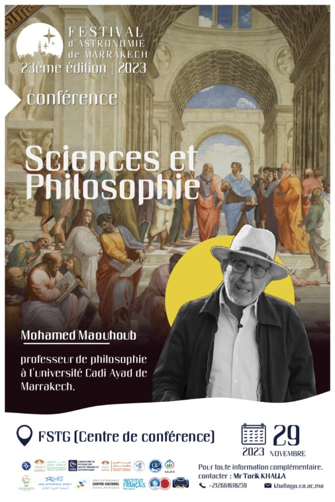 يتشرف نادي فيزياء الطاقات العليا و الفيزياء الفلكية بشراكة مع جمعية إنطلاقة و المقهى الأدبي دار سعيدة بدعوتكم لحضور محاضرة بعنوان “جواهر السماء” من تقديم الدكتورة مريم گنون، دكتورة في الفيزياء الفلكية و رئيسة جمعية علم الفلك بمراكش. و ذلك يوم السبت 23 مارس 2024 على الساعة التاسعة مساء بالمقهى الأدبي دار سعيدة.