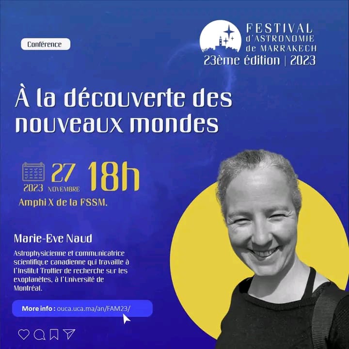 Courte bio : Marie-Eve Naud est astrophysicienne et communicatrice scientifique canadienne qui travaille à l’Institut Trottier de recherche sur les exoplanètes, à l’Université de Montréal. Sa spécialité : les exoplanètes, ces planètes qui se trouvent au-delà de notre Système solaire. Elle se passionne en particulier pour la grande question : « Sommes-nous seuls dans l’univers? ». Souvent invitée à donner des présentations dans les classes, des conférences ou des entrevues dans les médias, elle profite de toutes les plateformes pour partager avec petits et grands le travail des astronomes et son émerveillement pour le ciel et la nature.