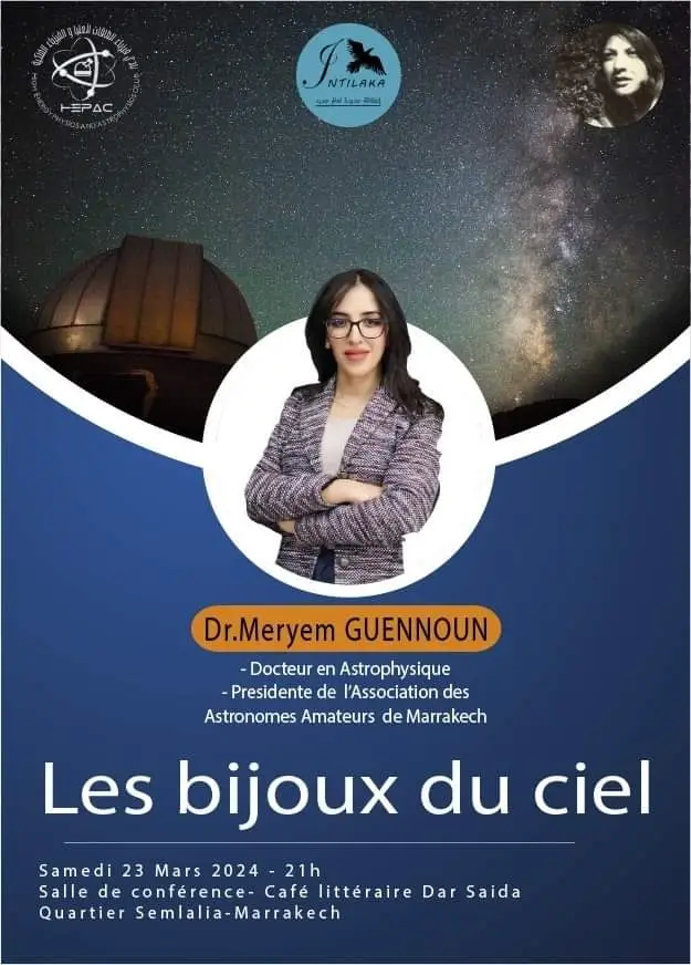 The High Energy Physics and Astrophysics Club, in partnership with the Intilaka Association and the Literary Café Dar Saïda, is pleased to invite you to attend a conference entitled “The Jewels of the Sky,” presented by Dr. Meryem GUENNOUN, astronomer and president of the Amateur Astronomers Association of Marrakech (3AM). This will take place on Saturday, March 23, 2024, at 9 p.m. at the Dar Saïda Literary Café.