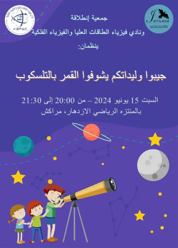 The High-Energy Physics Club, Astrophysics Club, and INTILAKA Association are pleased to invite you to an astronomical evening at the Izdihar sports park in Marrakesh. During the evening, you can enjoy the beauty of the moon through the telescope. Our meeting is on Saturday, June 15th, starting at 8:00 PM. Bring your children to see the moon through the telescope.